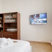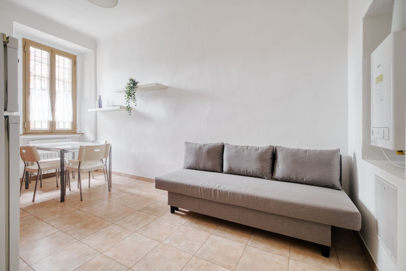La zona living è ampia e accogliente, perfetta per rilassarsi insieme dopo una giornata in città, con area relax, TV e un comodo divano letto che offre ulteriore flessibilità per gli ospiti.